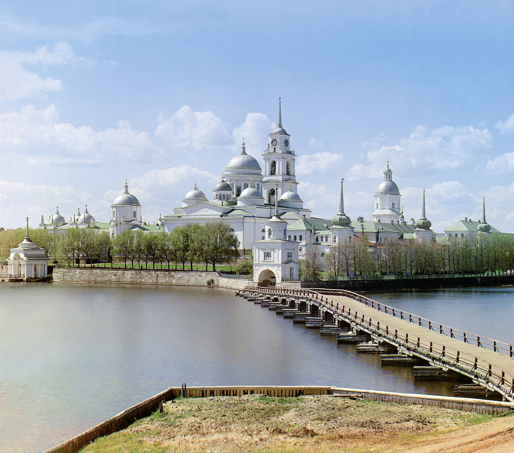 На снимке вид на православный мужской монастырь Нило-Столобенская пустынь со стороны полуострова Светлица, на озере Селигер. Дата основания монастыря 1594 год. Снимок сделан в 1910 году.