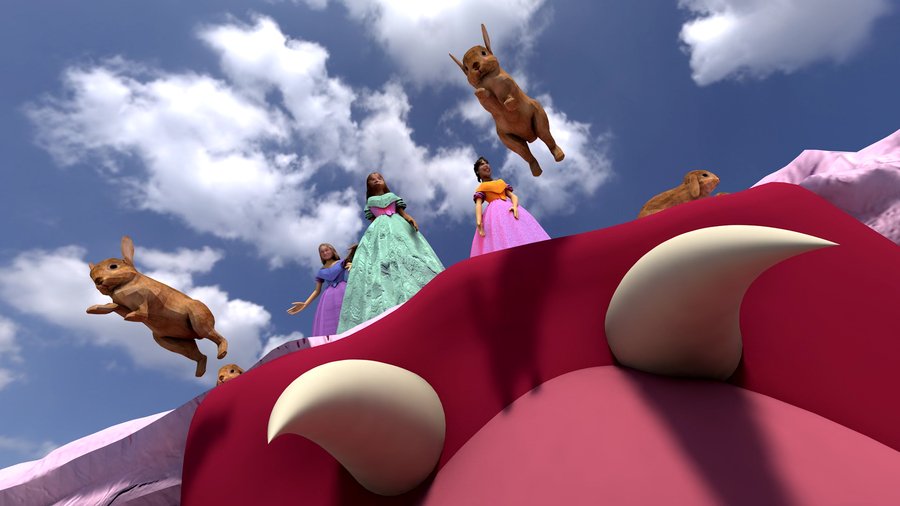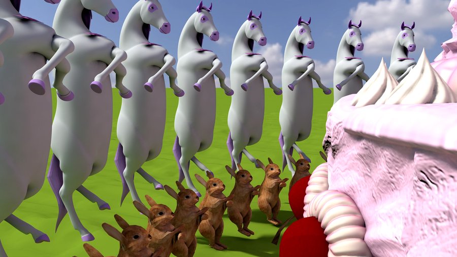 Зритель попадает в розовый мир с летающими котиками и улыбающимися принцессами, однако со временем картина искажается — торт начинает пожирать кроликов, а девушки терять человеческий облик, превращаясь в гниющую массу.