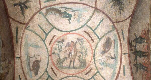 В условиях гонений ранние христиане создавали места для богослужений и захоронений в подземных катакомбах, таких как Катакомбы Присциллы в Риме. Эти пространства отличались скромностью и отсутствием излишнего декора. Стены украшались простыми фресками с символическими изображениями, такими как Добрый Пастырь или сцены из жизни Ионы, что подчёркивало духовную направленность и отказ от материального изобилия.