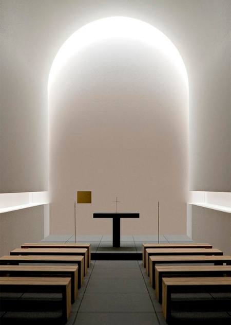 Современный католический храм, расположенный в пригороде Парижа, переосмысливает сакральное пространство в духе минимализма. Церковь выполнена из белого бетона и стекла: фасад глухой и монументальный, а внутреннее пространство освещается мягким рассеянным светом. Интерьер подчёркнуто пустой: нет витражей, фресок, даже традиционного алтарного убранства. Центральным элементом становится свет, как метафора божественного. Архитекторы переосмысливают сакральное пространство без привычной религиозной символики.