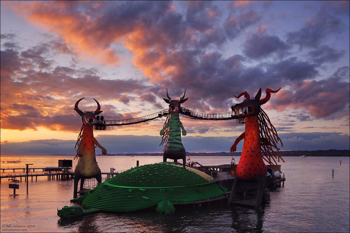 Опера Моцарта «Волшебная флейта» на прямую не относится к моей теме. Но декорации этой оперы для фестиваля в Брегенце ошеломили меня. «Волшебная флейта» известна как Масонская аллегория. Королеву Ночи представляет церковь, в то время как Зарастро представляет Просвещение. Опера полна тайного символизма. Три огромных дракона, которые, кажется, сторожат волшебный зеленый холм — Разум, Мудрость и Природа. Есть догадки, что причиной смерти Моцарта через 2 месяца после премьеры «Волшебной флейты» могла стать месть тайного сообщества «Вольных каменщиков», секреты служения которого выставлены в опере на всеобщее обозрение. Интересно, что взаимодействие с масонством началось у Моцарта в 11 лет, когда мальчик в качестве благодарности за изличение от оспы написал музыку к масонскому гимну и подарил партитуру доктору. Но стоит отметить, что Дэвид Паунтни оставляет в стороне философию моцартовской оперы и масонские мотивы, его цель — поразить созданием необыкновенного, единственного в своем роде зрелища.