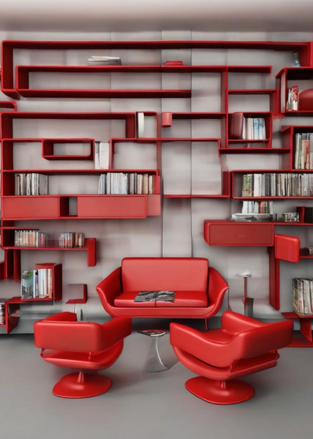 generate an image of a Bauhaus-style magazine rack in red, which stands in a large spacious light-colored room with furniture made of stainless steel