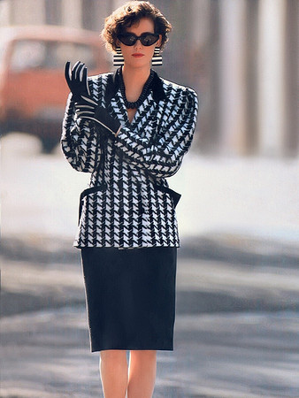 Одним из основных атрибутов архетипа «Power Woman» можно считать костюм с усиленным верхом, получивший особую популярность в 80-е годы. Среди причесок преобладают короткие волосы или волосы, собранные в гладкий пучок.