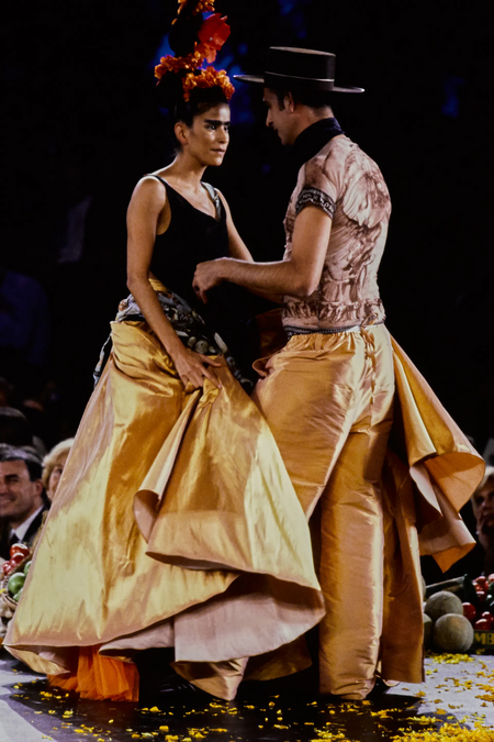 Слева: Автопортрет Фриды Кало, посвященный Льву Троцкому (1937). Справа: Jean Paul Gaultier Spring (1998) Ready-to-Wear / Vogue runway