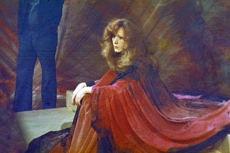 Слева: Алла Пугачёва в красном платье-балахоне. Справа: фрагмент клипа «Арлекино»