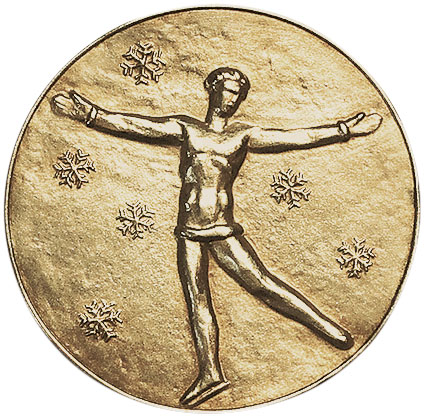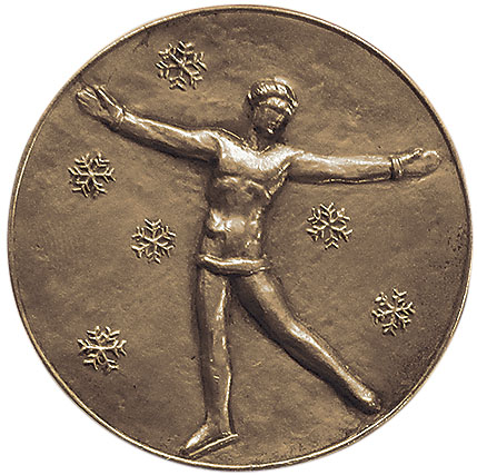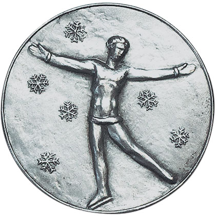Аверс: в середине медали фигуристка в танцевальном движении, вокруг летящие снежинки.