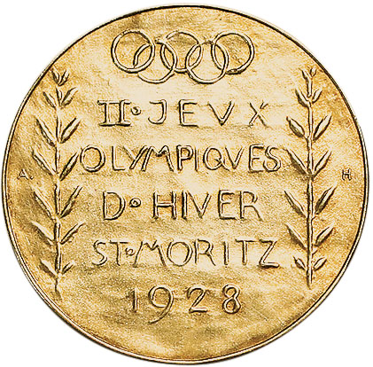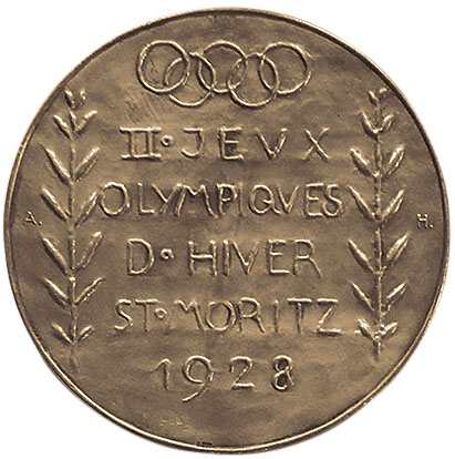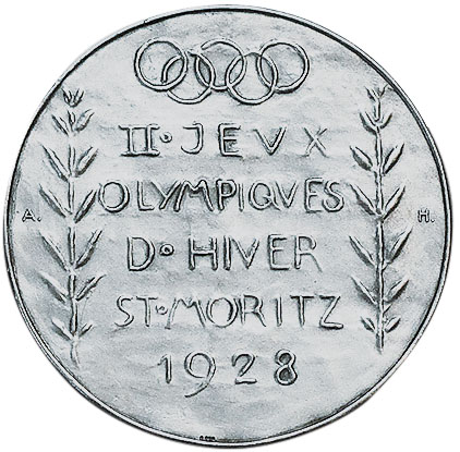 Реверс: вверху олимпийские кольца, под ними в обрамлении стилизованных оливковых ветвей текст в пять строк на французском языке: II·JEUX OLYMPIQUES D·HIVER ST·MORITZ 1928 (II зимние Олимпийские игры Санкт-Мориц 1928). Посередине, слева и справа, инициалы художника: «А.» и «Н.».