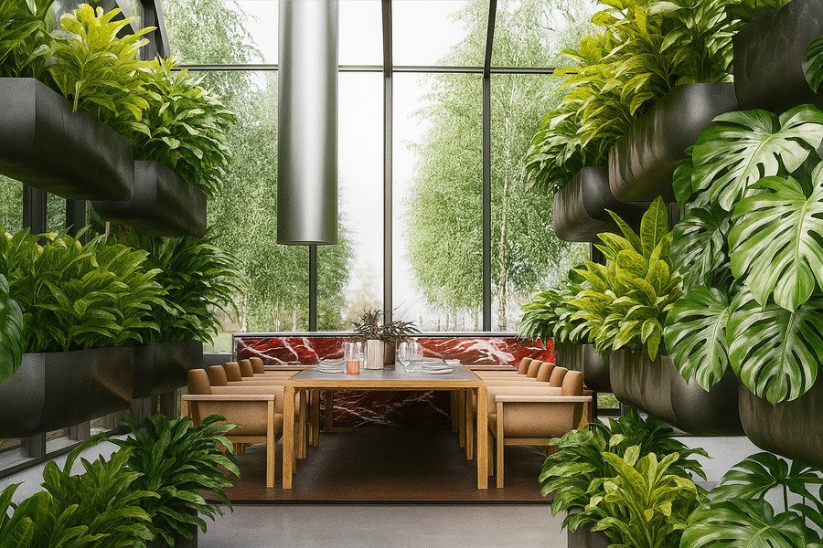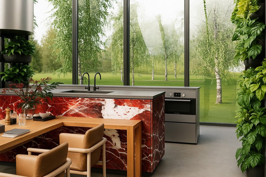В интерьере присутствуют акценты из красного мрамора, которые визуально напоминают стейк. Также мне очень хотелось передать холодность региона, поэтому в доме спроектированы невысокие окна с деревянными ставнями. Важной частью дома является оранжерея, которая позволяет шефу выращивать свежую зелень для своих блюд.