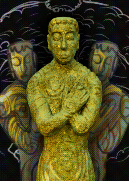 Скульптуры должны были выглядеть разрушенными, но при этом узнаваемыми, поэтому главным методом работы стал скульптинг. Я решила сохранить некие общие человекоподобные формы, избегая серьезной детализации в каменных изваяниях. В случае же с центральной фигурой было решено вылепить как черты лица, так и узоры на теле.