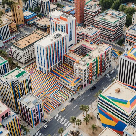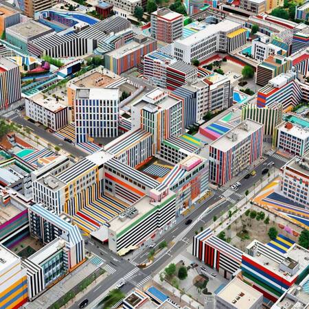 Нейросеть: Krea Промт: Паттерн из домов в стиле художника Даниэля Бюрена. Полосы должны быть яркие и составлять ритмическую композицию. Стиль реализм