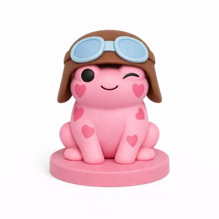 Промпт: сгенерируй игровую фигурку для настольных игр в виде розовой подмигивающей лягушки с темно-розовыми пятнами в виде сердец по телу и в светло-коричневой шапке авиатора с голубыми очками, стоящей на круглой подставке. Стилистика максимально упрощённая, мультяшная и приближенная к промптам выше. Материал фигурки — пластик для 3d печати.