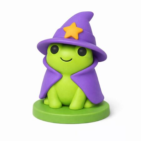 Промпт: сгенерируй игровую фигурку для настольных игр в виде мультяшной зеленой лягушки, стоящей на круглой подставке, в фиолетовом плаще и остроконечной шляпе с оранжевой звездой. Стилистика максимально упрощённая, мультяшная. Материал фигурки — пластик для печати.