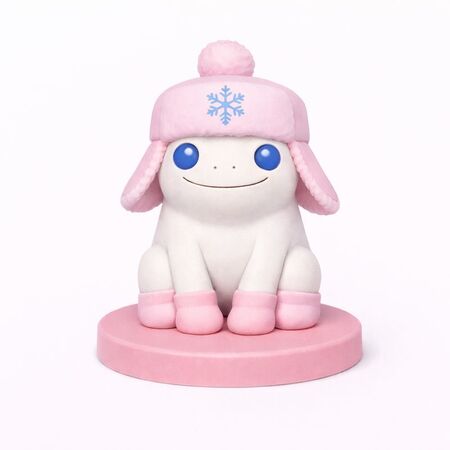 Промпт: теперь в выдержанной стилистике, пожалуйста, сгенерируй добрую белую жабку с синими однотонными глазами и в светло-розовой шапке ушанке с помпоном и синей снежинки снежинкой.
