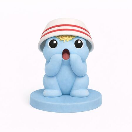 Промпт: сгенерируй, пожалуйста, игровую фигурку светло-синей удивленной лягушки, с широко открытыми глазами и ртом, на голове перевернутая белая пиала с красными полосами на круглой подставке. Подними передние лапки к мордочке и добавь в зазор между чашкой и головой лапшу стилистика приближенная к промптам выше.