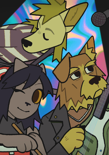 Псы, котики, рок’н’ролл — подростковый комикс, в котором события происходят в альтернативном мире, населенном животными. Сеттинг опирается на музыкальную поп-культуру 80-00х годов, включая в себя отсылки на популярные группы. В центре сюжета находится героиня-кошка, которая стремится исполнить свою мечту: стать барабанщицей в рок-группе. Однако преградой к ее мечте являются укоренившиеся стереотипы, в которые верят и ее ровесники, и ее семья. Зачем кошке играть рок, если это удел собак и дворняг?