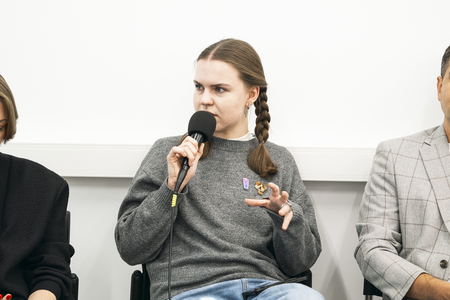В следующей дискуссии модератором выступила Дарья Эпин — бренд-менеджер программы «Современное искусство» в Школе дизайна НИУ ВШЭ.