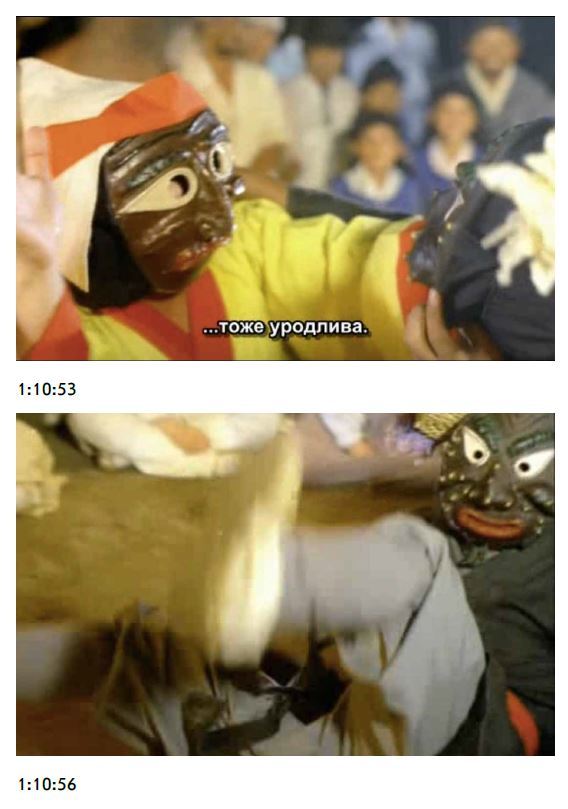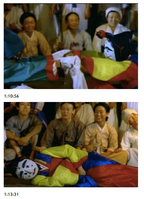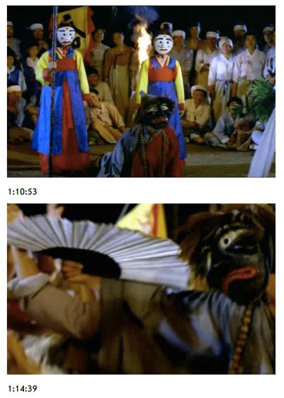 В конце фильма учитель музыки, стоя на фоне масок, высказывает зрителям мораль показанной истории. Глобально она не особо отличается от традиционных сюжетов корейского театра. В годы японской аннексии Корейского полуострова (1910-45) народное театральное искусство, как и всё исконно корейское, подвергалось гонениям. Только начиная с 60х годов, когда и был снят фильм, стали производиться попытки восстановления традиционных представлений с масками.