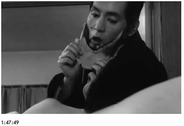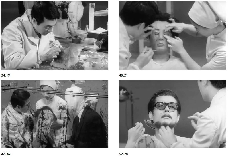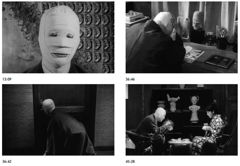 Доктор предлагает герою пересадить ему чужое лицо, и они находят человека для подобной сделки, всего за 10000 йен. Почти как продать душу, только кожу с головы. После операции ученый говорит: «Какое странное ощущение, как будто кто-то вселился в меня». С чужим лицом он становится свободным от своей прошлой роли и личности. Позже он пробует вступить в близость со своей женой, исполняя новую роль, не себя, но она раскрывает его. Опять повторяется мотив про макияж у женщин. «В любви мы все пытаемся сорвать чужие маски».