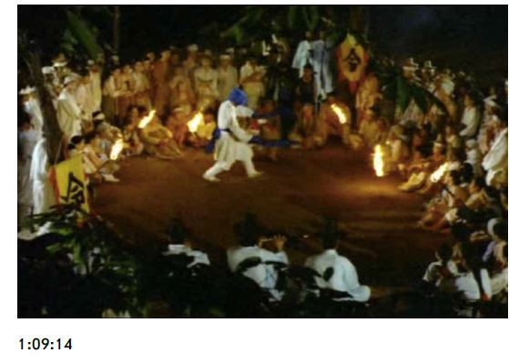 За стендом стоит человек в маске Хётокко. Далее трое незнакомцев с масками идут к мосту, под которым ночуют Савако и Мацумото, и крадут девушку. В темноте освещается удочка, на которую клюет рыба, что тоже является отсылкой к традиционной фестивальной игре (также удочку ранее в фильме ставили другие персонажи). За неизвестными из-за связывающей пару красной веревки, как пойманный на удочку, тащится по земле спящий Мацумото. За этим следует вид на дерево в затуманенном поле, под которым трое насилуют девушку. Вид на одинокое дерево в поле потом появляется в конце фильма, перед тем как эта пара упадёт со скалы.