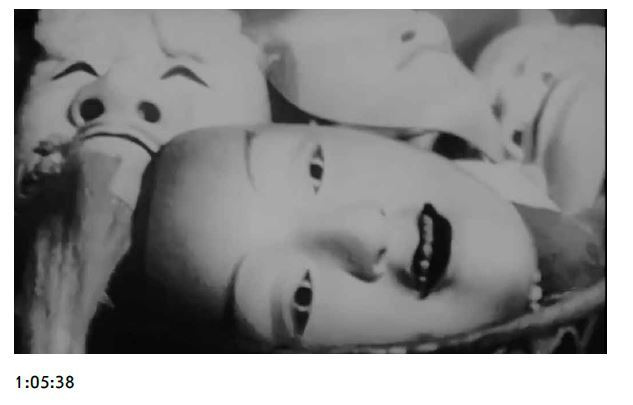 Кадр сменяется, рядом с фигурой девушки оказывается маска с нелепым выражением лица, и когда она чуть наклоняется, из-за её спины показывается ранее заслоняемая вторая маска. Девушка уже играет, сменив сухой взгляд на нарочито грустный, с высоко поднятой серединой бровей. Меняется её интонация и посыл по отношению к мужчине. В моменте, когда в кадре появляется маска, героиня сама «надевает» фальшивое лицо и начинает манипулировать другим человеком с её помощью.