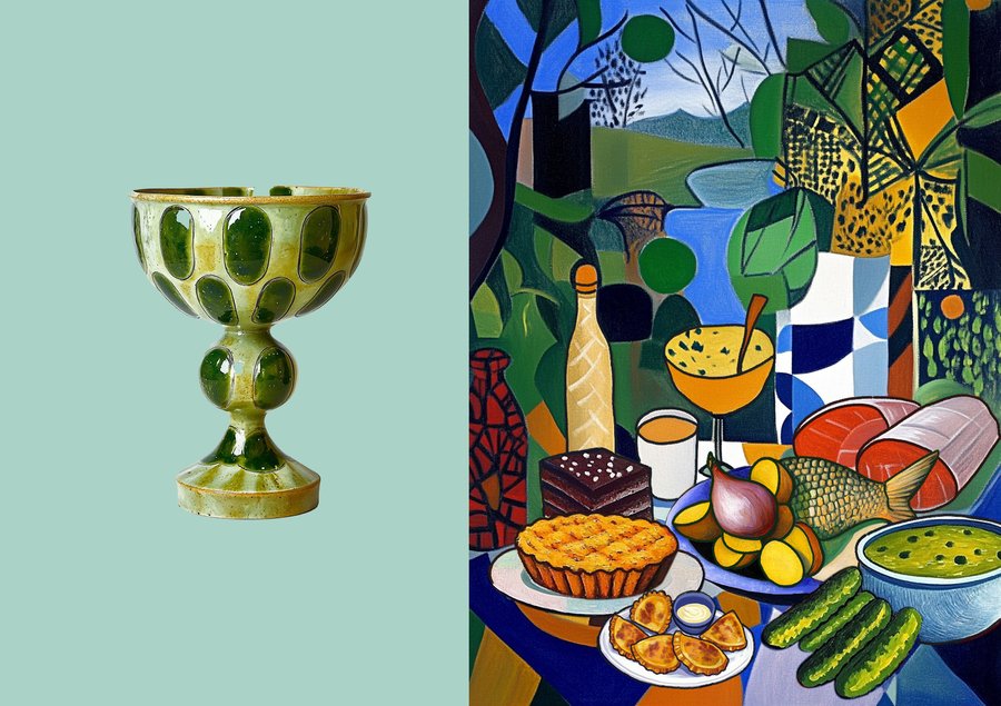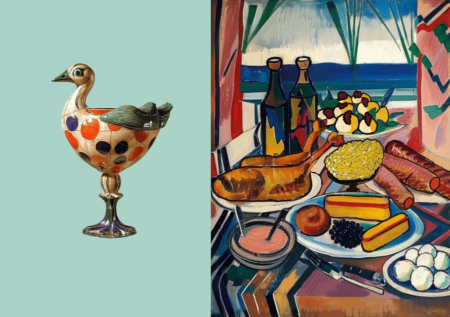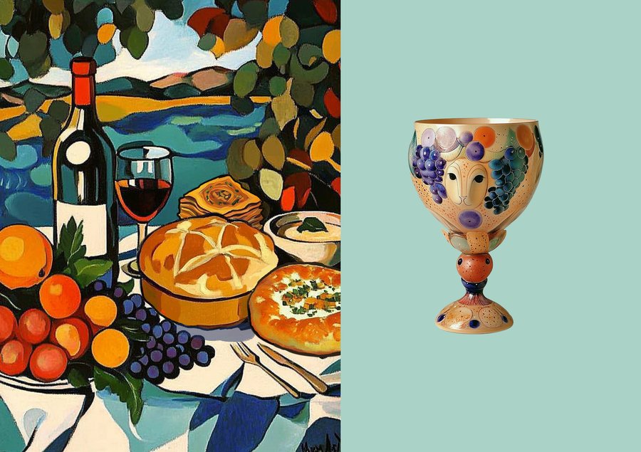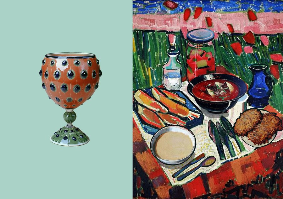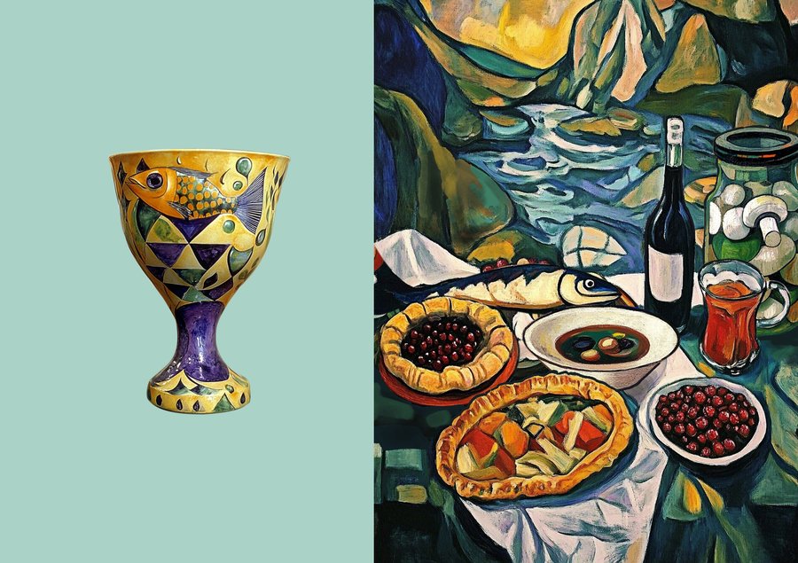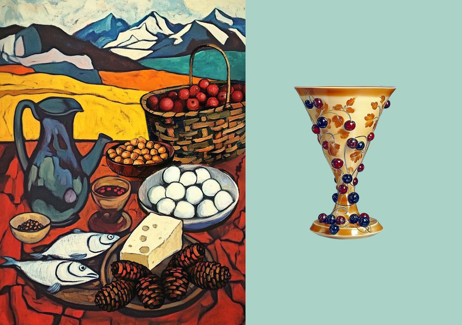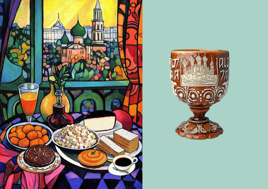 Серия декоративных натюрмортов, выполненных с помощью нейросетей Ideogram и Midjourney, отражающих культуру народов России через их национальную кухню.