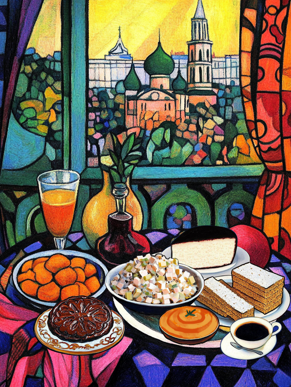 В моем проекте представлена серия декоративных натюрмортов, выполненных с помощью нейросетей Ideogram и Midjourney, и отражающих культуру народов России через их национальную кухню.