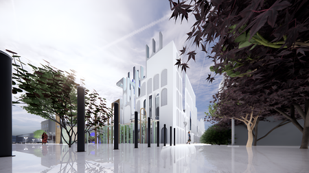 The concept of the graphic facade is to simulate the movement of water in simple forms — closed plastic lines — encircling the building of the CDC. The image of the water is animated, and in the skate at the frontal facade, the flow of water closes, creating the illusion of an endless flow of water.
