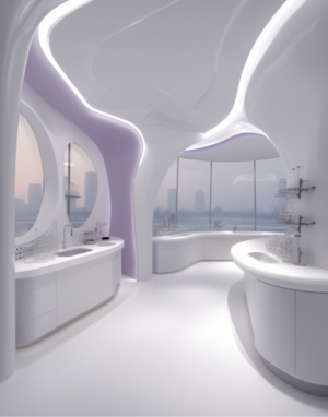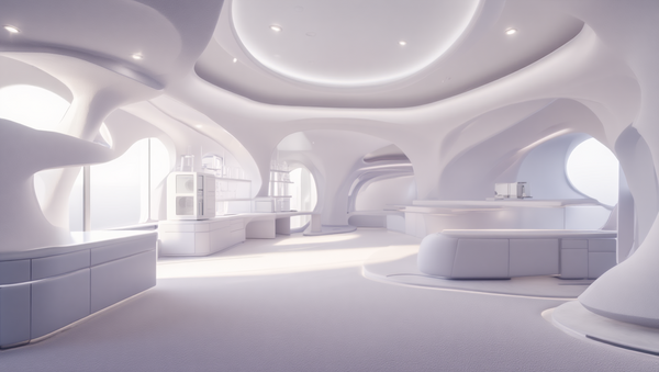 In the style of the exterior, create an interior Futuristic laboratory in an organic architectural style, with smooth white and translucent forms, glossy surfaces, soft diffused lighting, an interior with biomorphic curves, a sterile and refined atmosphere, a combination of laboratory equipment and the architecture of the future, inspired by the aesthetics of Zaha Hadid and science fiction design, pastel shades of white, purple, and silver, minimalism, and soft reflections.