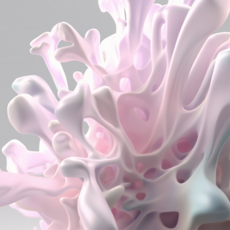 Macro rendering of organic chemical forms in the style of Zaha Hadid: smooth soft-touch texture, pearl white and lavender-lilac gradient, translucency, curves reminiscent of a splash, porous structure.
