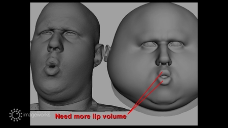 «Это было крайне сложной задачей, потому что, как только начинаешь искажать лицо, оно тут же приобретает стилизованный вид. Пейтон хотел, чтобы, внешность актёра сохранялась максимально узнаваемой, несмотря на искажения. Мы тщательно анализировали каждый кадр и постоянно пытались понять, в чём заключается проблема с моделью и почему она возникает. Иногда нам приходилось корректировать анимацию лица, чтобы компенсировать искажения, а иногда — вносить изменения в визуальную разработку (lookdev).»[8]