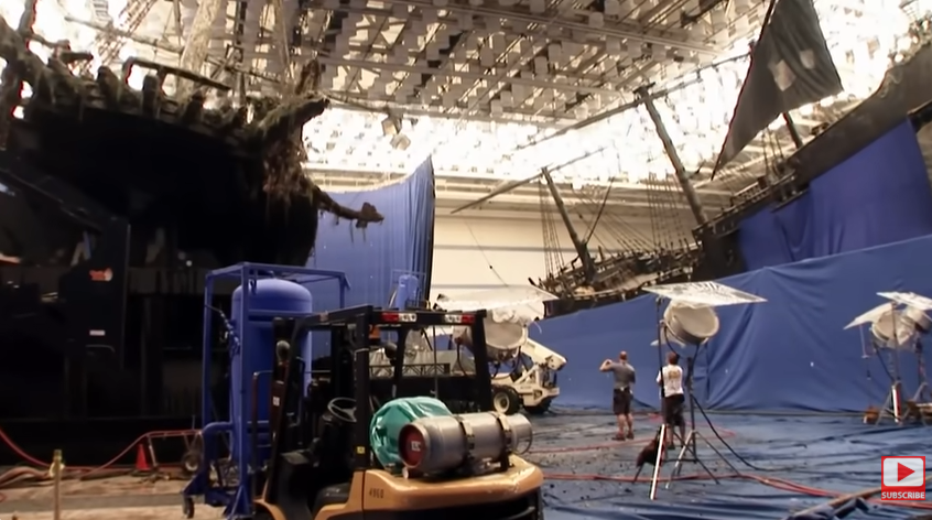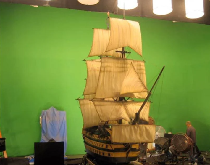 Яркий пример использования моделей кораблей в приключенческой кинофраншизе «Пираты Карибского моря». Основой для новой «Жемчужины» послужила 35‑метровая дизельная лодка, к которой прикрепили декоративные панели, воспроизводящие силуэт судна XVIII века. Чтобы обеспечить динамичное маневрирование, на носовой части смонтировали дополнительный двигатель. Для съёмок макетов «Чёрной жемчужины» и «Летучего голландца» задействовали высокотехнологичные подвижные платформы: корабли были приподняты на 4,5 м и каждый поставлен на две опоры (на носу и на корме). За счёт регулировки опор достигался эффект натуральной качки: вертикальные колебания точно воспроизводили движение корабля в океанских водах. Управление платформами и опорами осуществлялось с помощью компьютерной системы.