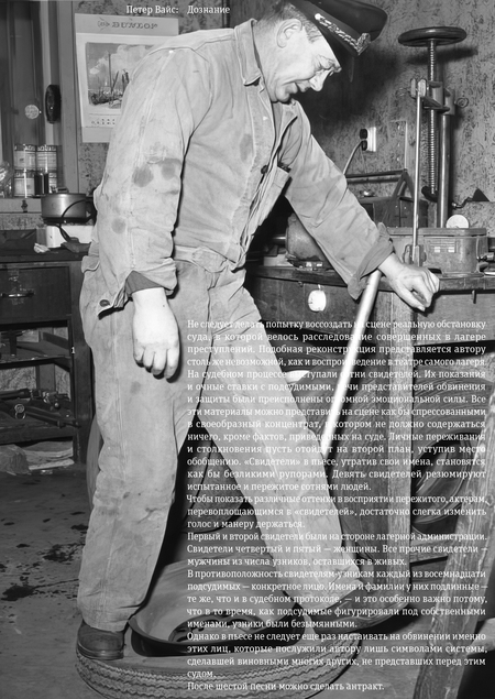«Дознание» Оратория в 10 песнях — пьеса драматурга Петера Вайса 1965 года, в которой средствами документального театра рассматривается первый Франкфуртский процесс над Освенцимом 1963–1965 годов. Вайс сам принимал участие в Освенцимском процессе в качестве зрителя и разработал свою пьесу на основе протоколов Бернда Науманна