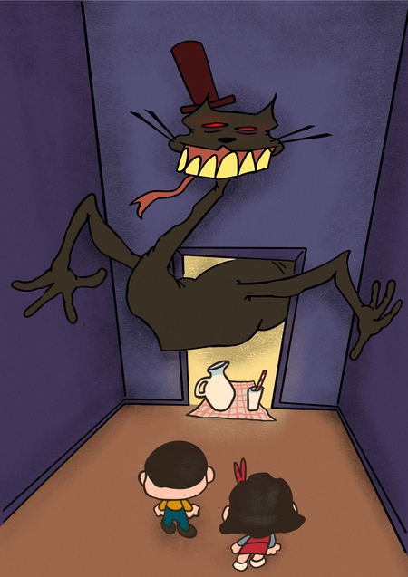 Детишкам Конраду и Салли скучно в дождливый серый день. Однако, в голову к ним приходит идея для развлечения — призвать демонического кота в шляпе. Вопреки просьбам рыбки не делать этого, страшный гость всё же появляется в доме. И кажется, рыбка была права: зря кота позвали!