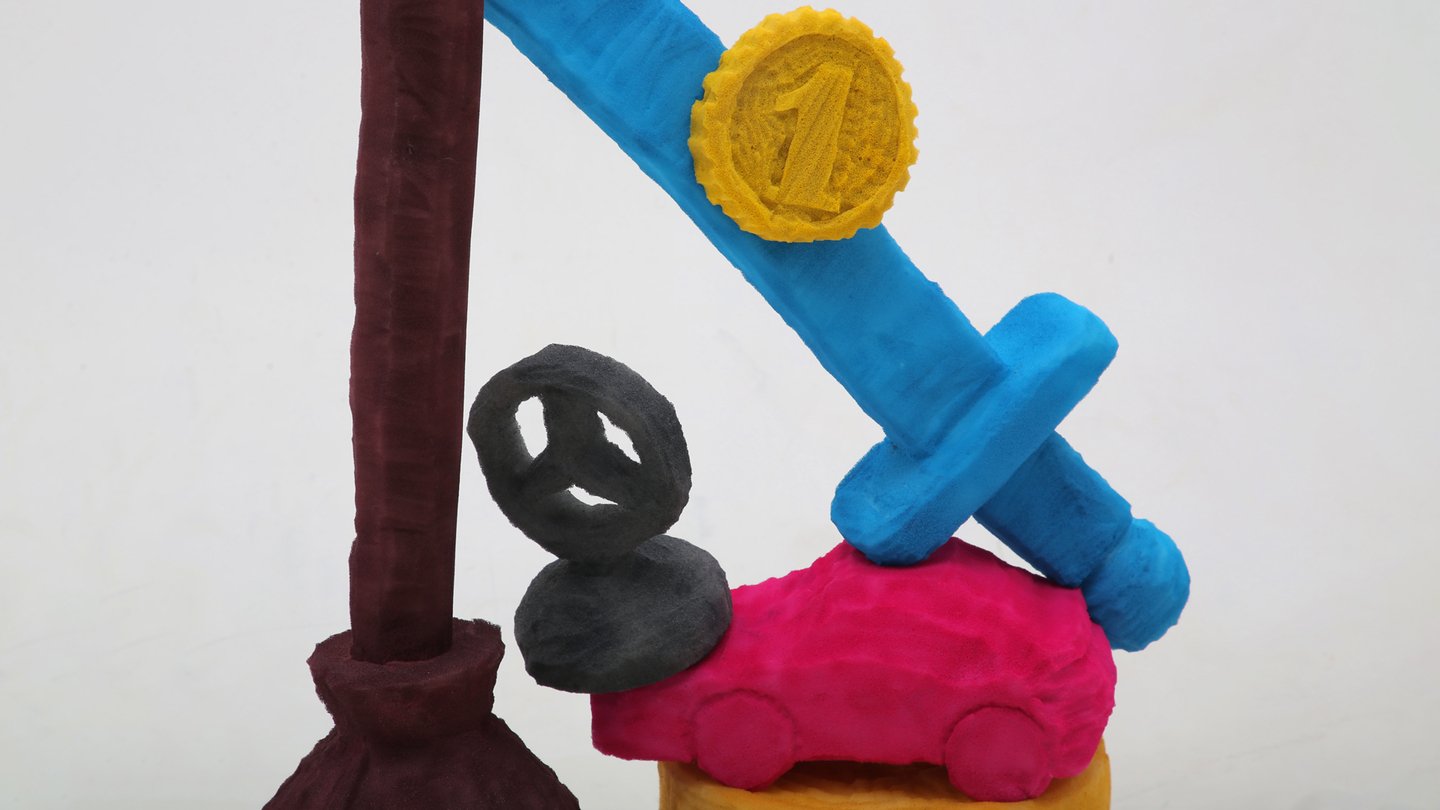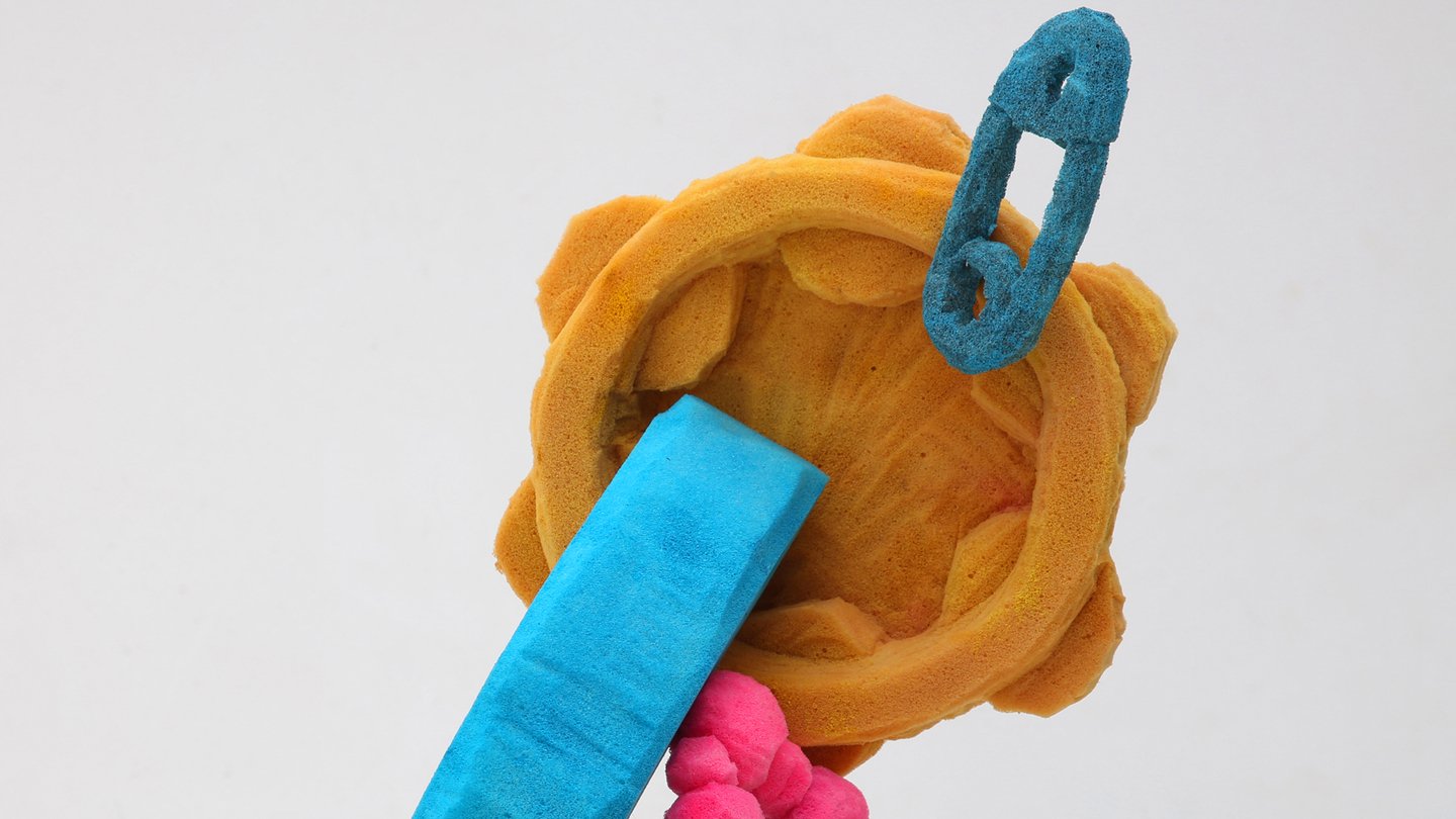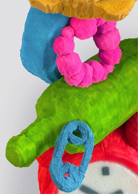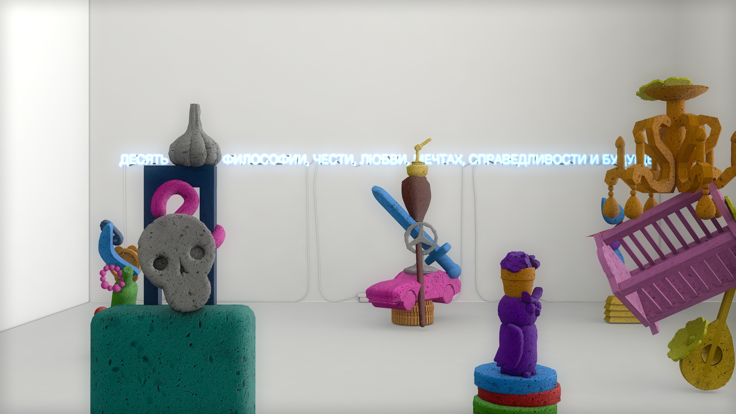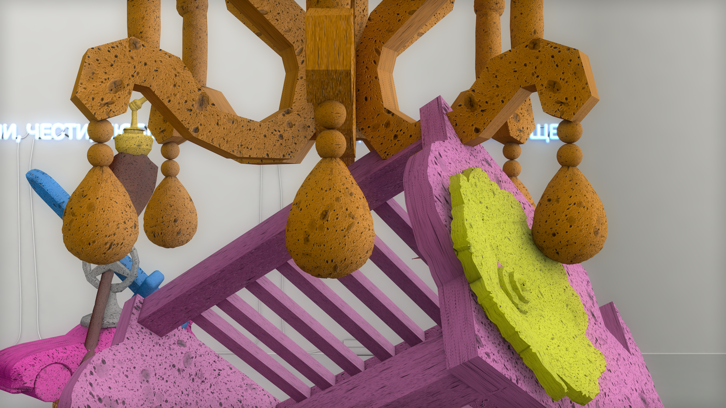 Эти объекты изготовлены из поролона, который сам, будучи легким пористым материалом, лишь создаёт видимость материальности, подчёркивая тем самым иллюзорность любых определений.