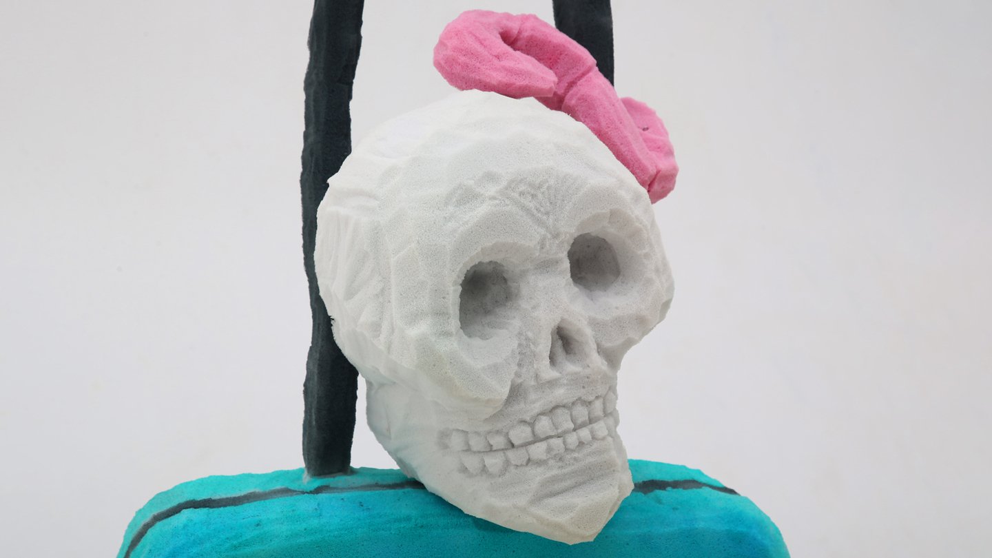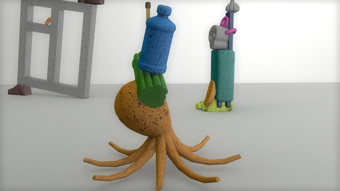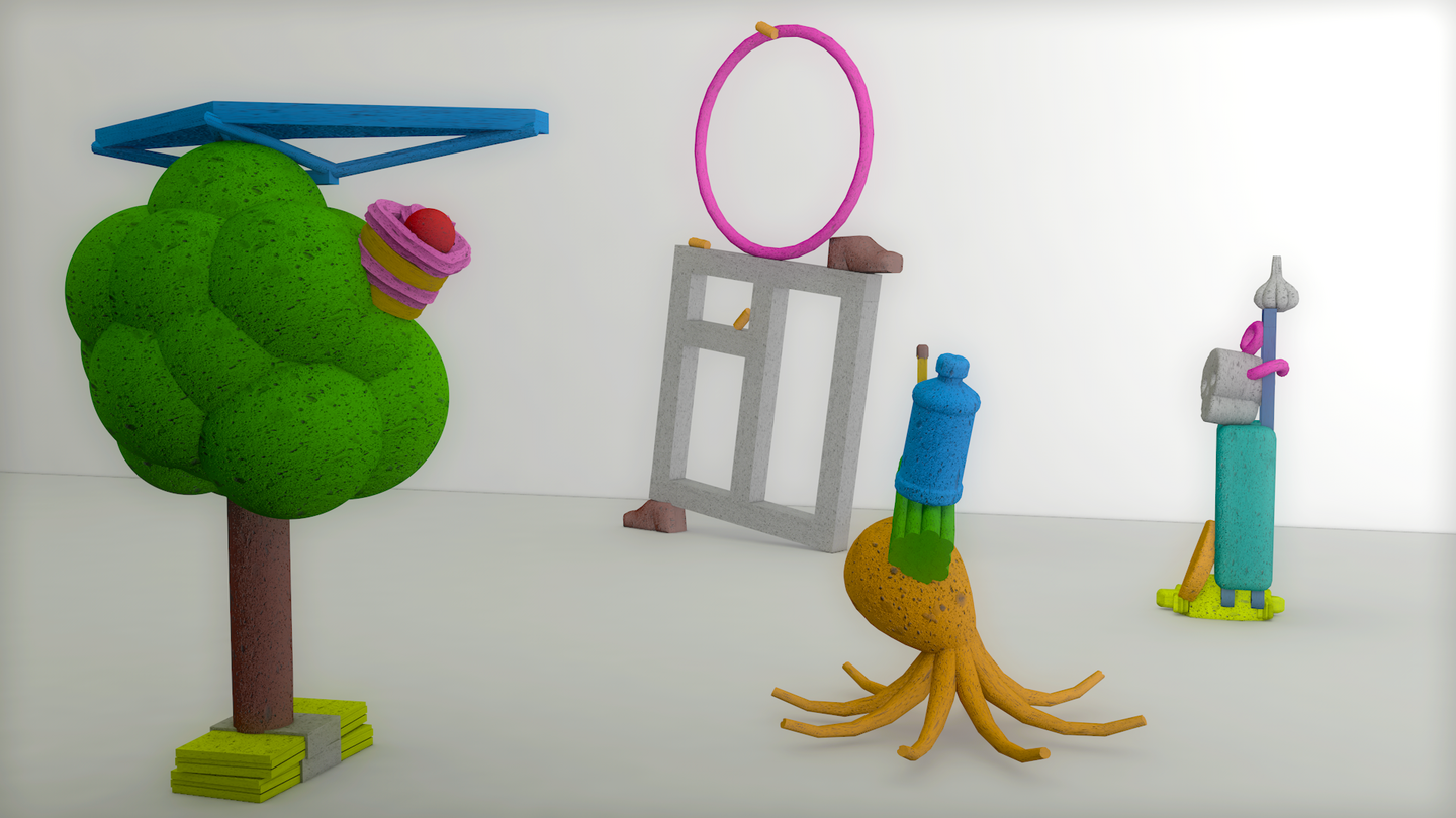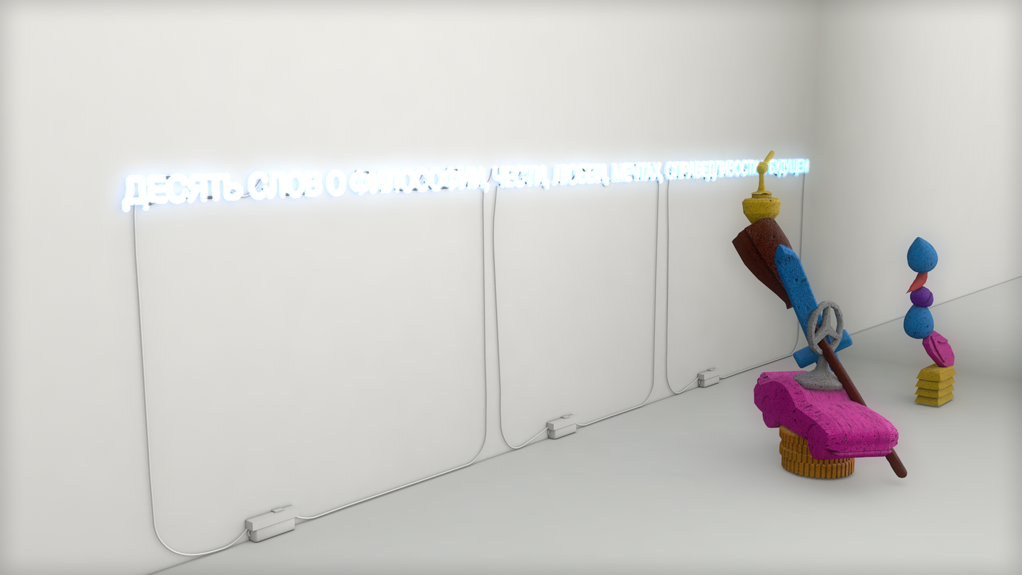 Эти объекты изготовлены из поролона, который сам, будучи легким пористым материалом, лишь создаёт видимость материальности, подчёркивая тем самым иллюзорность любых определений.