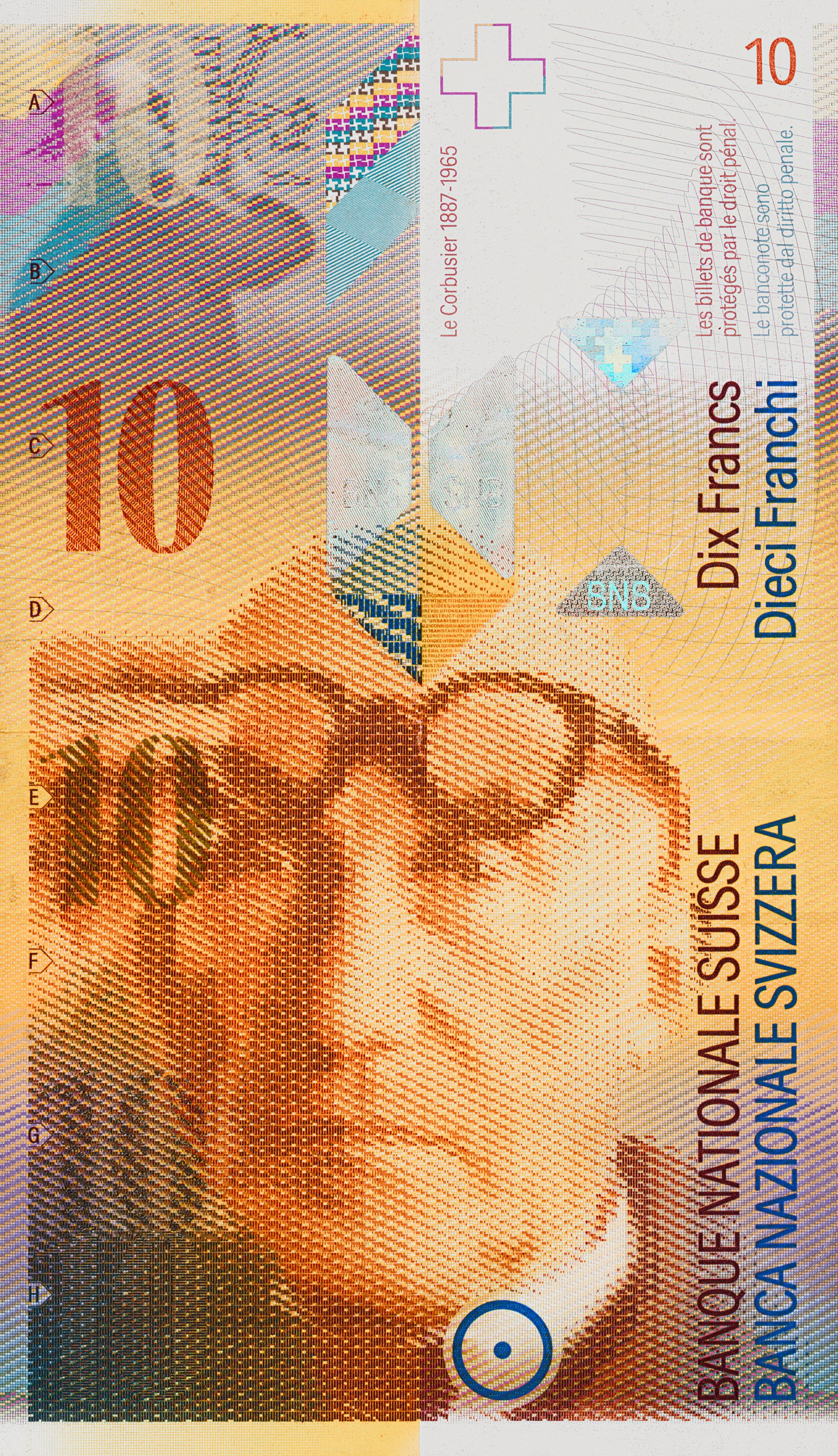 Купюра достоинством 10 франков была выпущена Банком Швейцарии в 2013 году. На лицевой стороне, в левой части и в правом верхнем углу расположены портреты знаменитого французского архитектора Ле Корбюзье. На оборотной стороне размещено изображение Дворца правосудия в индийском городе Чандигарх, построенном Ле Корбюзье, а также одно из схематических отображений созданной им системы пропорционирования «Модулор».