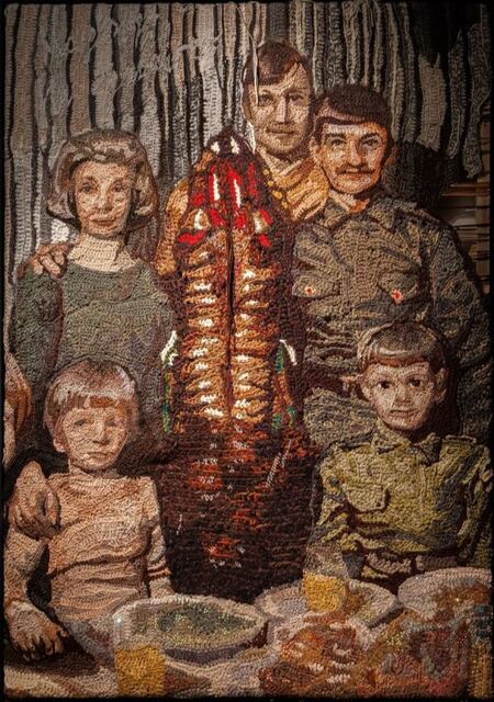 Во-первых, ее работы в целом часто строятся на контрасте старой, уютной техники вязания с совершенно неподходящими сюжетами. Например, в серии «Глитч» (2019-2023) Катика изображала технологические помехи.
