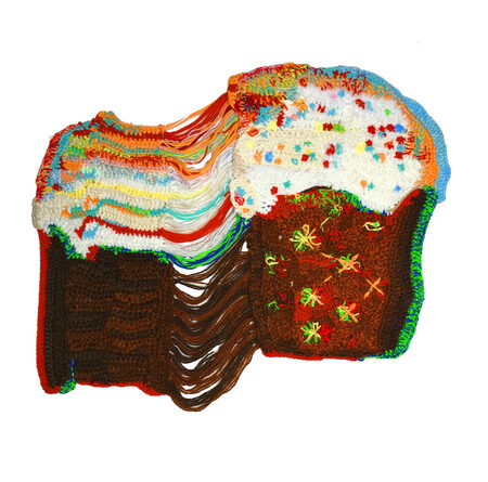 Во-вторых, интересно соотнести саму технику производства ее работ с текстом «Языка новых медиа». Л. Манович пишет о таком свойстве этих технологий, как дискретизация: цифровая камера подразделяет непрерывный окружающий мир на пиксели, каждый из которых наделяется числовым значением для сохранения в электронном формате. Катика для создания вязаного объекта тоже подразделяет некий изначальный образ на отдельные сегменты, каждый из которых выполняется той или иной пряжей.