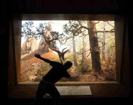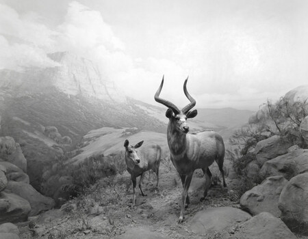 Хироши Сугимото начал свою раннюю серию фотографий «Диорамы» после прибытия в Нью-Йорк в 1974 году. Во время посещения Американского музея естественной истории художник сделал важное для себя наблюдение. Как вспоминает Сугимото: «Чучела животных, расположенные перед нарисованными фонами, выглядели совершенно фальшиво, но когда я смотрел одним глазом, они вдруг становились очень реалистичными. Я нашел способ увидеть мир так, как его видит камера». Сугимото начал фотографировать экспозиции с чучелами животных — он делал черно-белые снимки большого формата, создающие впечатление документальной фотографии дикой природы.