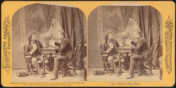 «Сон после встречи с призраком Пеппера». Неизвестный фотограф, стереофотография, раскрашенная вручную серебряно-альбуминовая печать. Ок. 1865 / Карточка «Слишком тонкая». L.M. Melander & Bro. 1874.