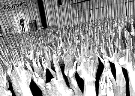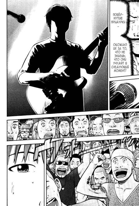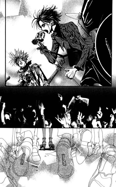 Интересно, что зрительный зал в комиксах показывают с разных позиций. Когда автор изображает ликующие, вдохновлённые лица зрителей глазами музыканта, мы видим обмен эмоциями между исполнителем и публикой: реакция фанатов становится своеобразным подтверждением его мастерства. А когда взгляд переносится на позицию обычного слушателя, мы словно сами оказываемся в толпе — вокруг лишь головы и поднятые руки, как на настоящем концерте. Такая визуальная достоверность позволяет читателю буквально почувствовать своё присутствие и сильнее пережить музыку через эмоции.