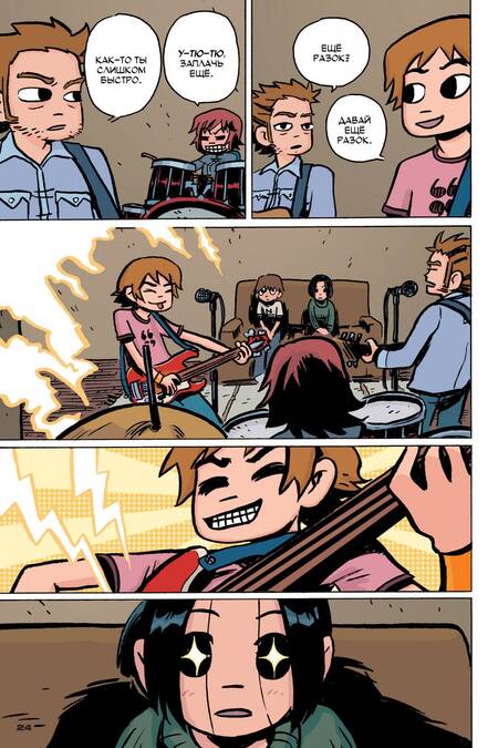 В данном примере подписаны не только аккорды под каждым словом, но и есть заметка о том как эти аккорды играть; «Скотт Пилигрим» (2004 — 2010)