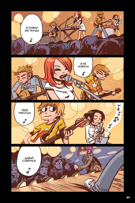 Есть и необычная альтернатива, когда вместо нот используются аккорды и фрагменты текста песен с пометками, как в комиксе «Скотт Пилигрим». Они служат визуальной подсказкой: мы понимаем, какую гармонию играет персонаж, чувствуем смену тональности и энергию момента. Эти аккорды — минимум информации, которого достаточно, чтобы представить звучание песни, особенно если читатель знаком с базами музыкальной теории. Здесь создаётся уникальный эффект: музыка становится понятной через символы, а не через изображённые ноты.