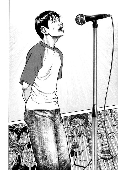 Публика нередко появляется на страницах комиксов, однако в «Синем гиганте» используется особенно интересный приём. Вместо бушующей толпы читателю показывают индивидуальные реакции каждого зрителя на музыку, которую они воспринимают по-своему. Благодаря этому сцена деликатно передаёт весь спектр чувств, и читатель проживает выступление глубже, словно пропускает через себя разнообразные впечатления других людей.