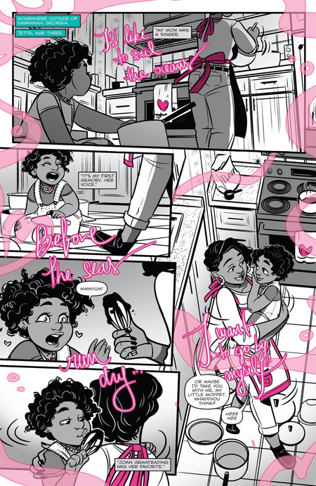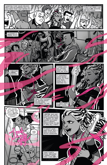 Цветной поток музыки особенно впечатляет на чёрно-белых страницах. Яркое звучание резко выделяется на фоне окружения и создаёт ощущение, будто именно музыка оживляет пространство: цвет тянется за персонажами, связывает разные моменты и подчёркивает, как сильно мелодия меняет обстановку сцены.