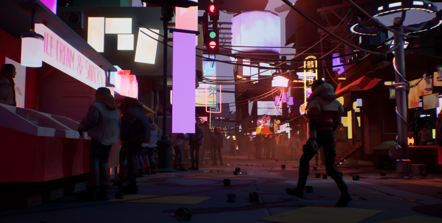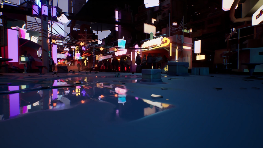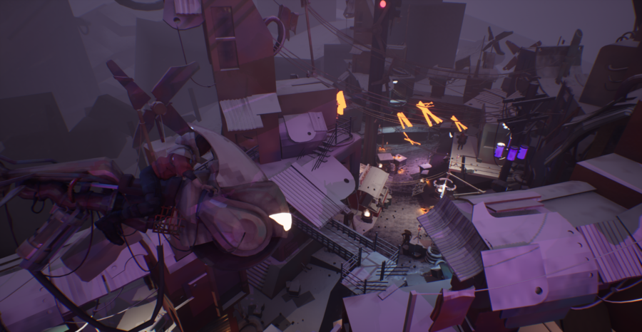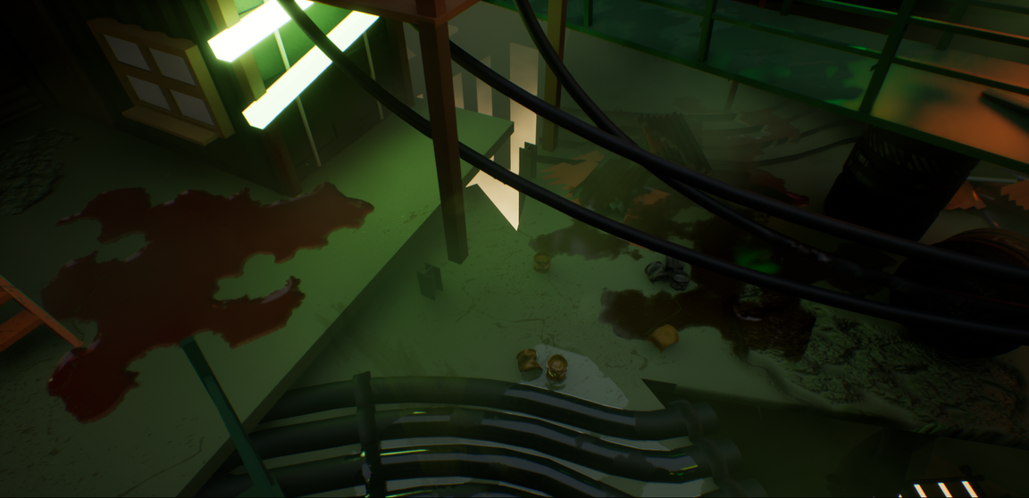 Я прорабатывал окружение с помощью объёмных декалей, следов дождя и крови, а также процедурного размещения мусора через Foliage.