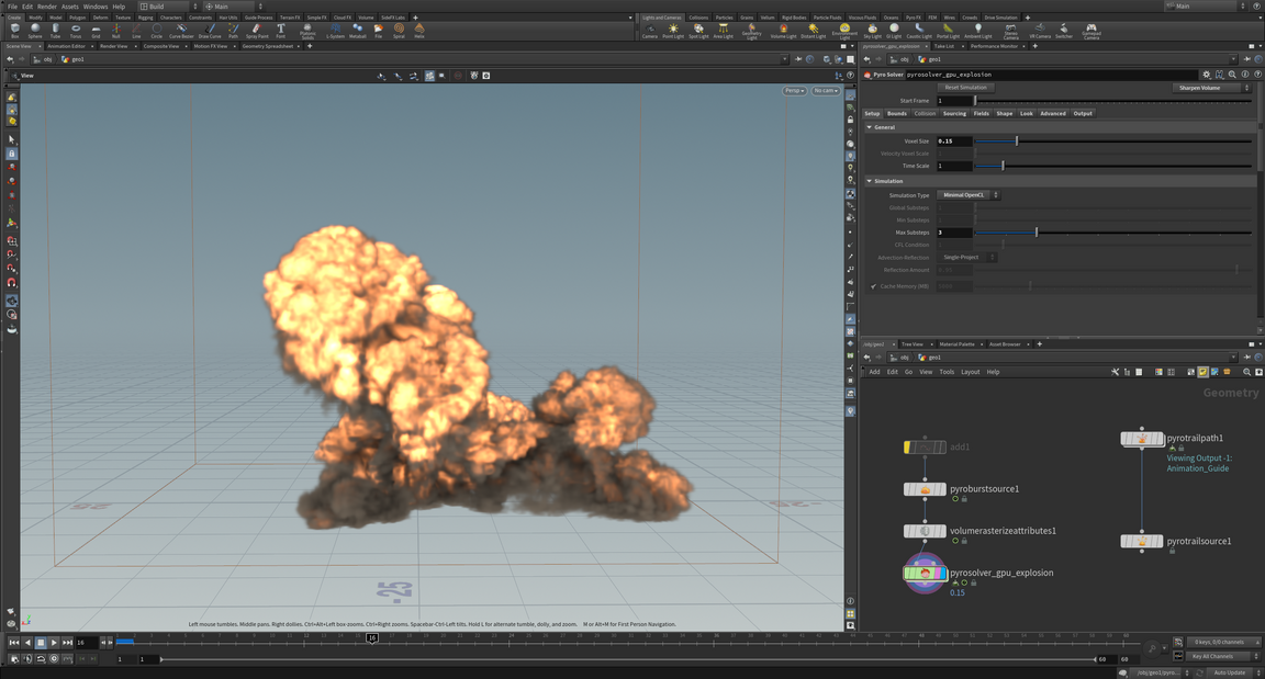 Для одного из трейлеров игры мною также были созданы эффекты взрывов, созданные с помощью экспорта spritesheet, поулченных в результате настройки и последующего рендеринга PyroFX симуляции в Houdini.