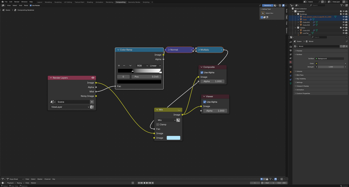 Финальная обработка рендеров велась в Blender с помощью композитинга: был добавлен эффект тумана, картинка была сведена к холодным тонам.