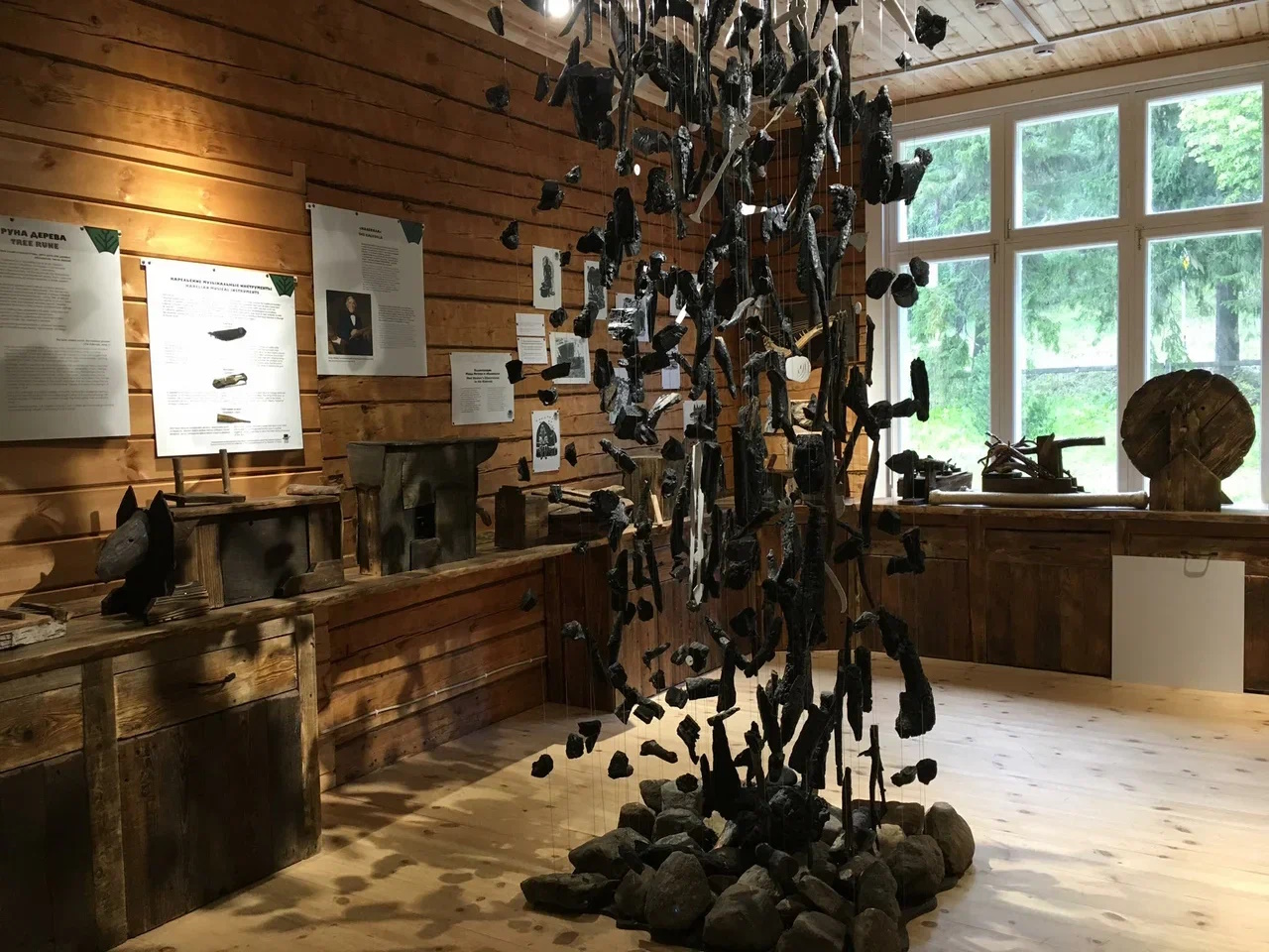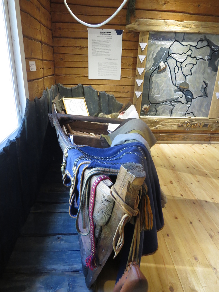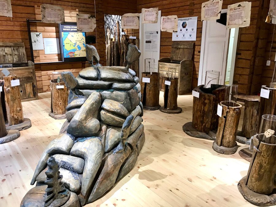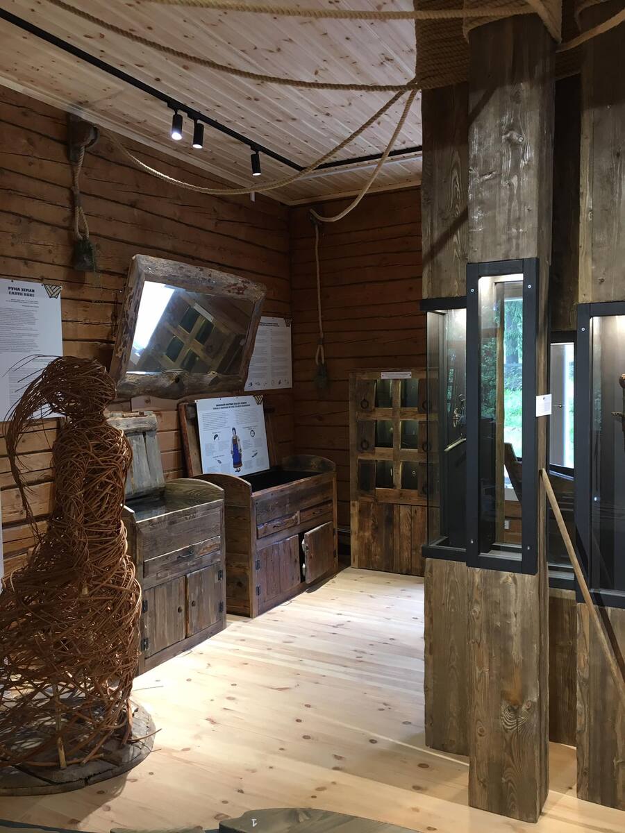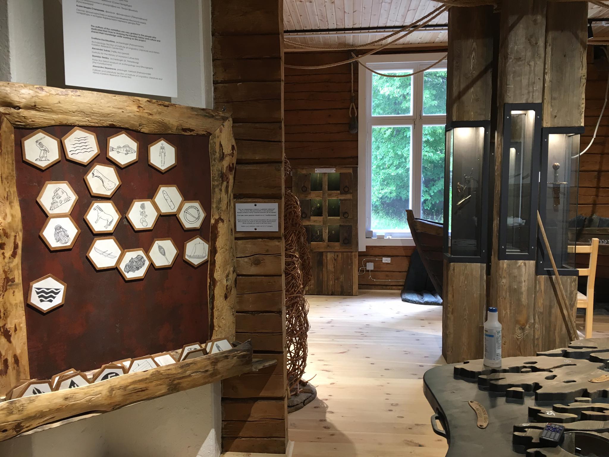 Зачин экспозиции образ горы — герой Калевалы Випунен. имеет своей целью, во-первых, поместить посетителя в определенное пространство, во-вторых, задать систему координат и создать нужный настрой (в том числе, на то, что получение знаний и эмоций на этой экспозиции — это не пассивный, а активный процесс). Здесь символы (камень, дерево, земля, вода, железо, огонь) предстают в буквальном смысле, как характеристики места. Макет раскрывает тему природных и географических ресурсов места. Макет интерактивный — 6 элементов заложены внутрь, и нужно проделать определенные манипуляции, чтобы получить из них знание.