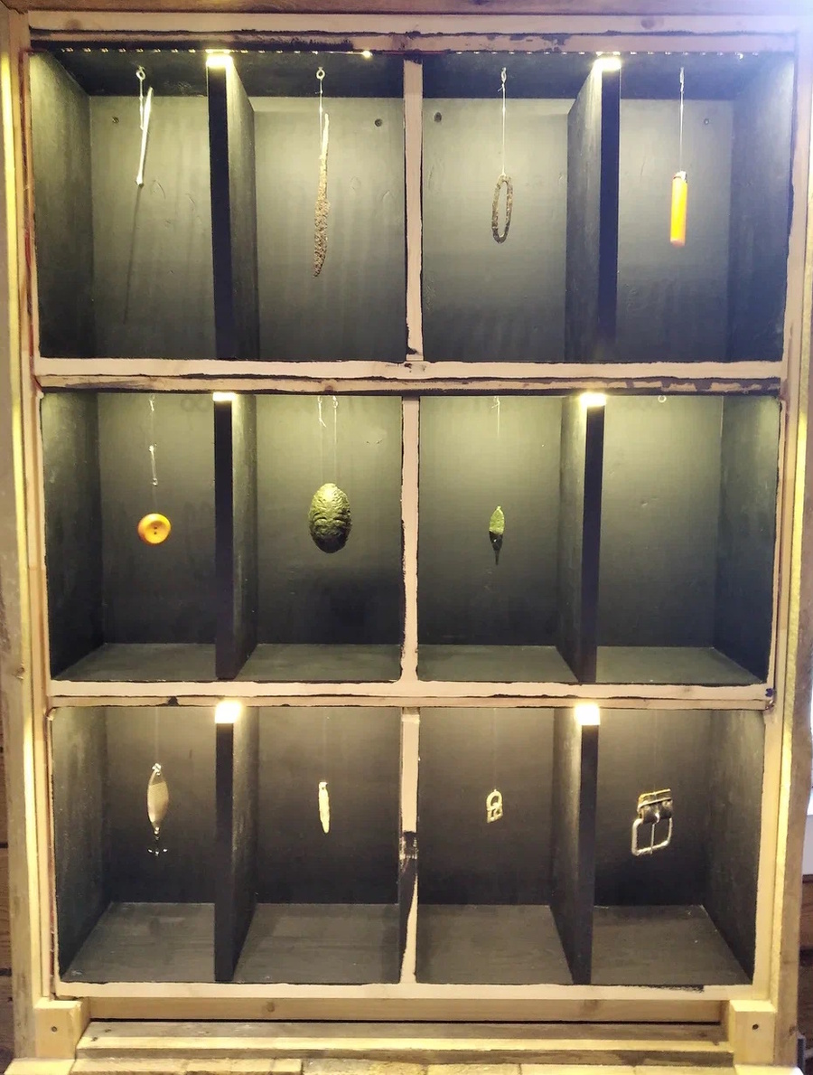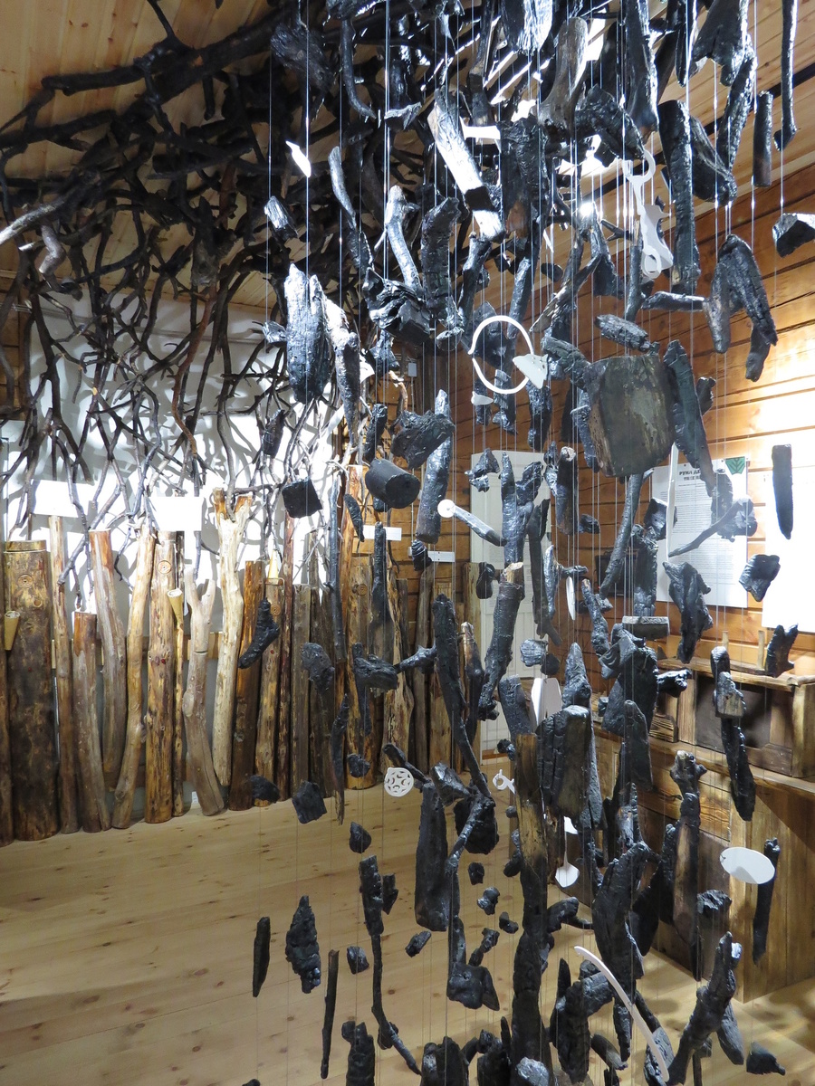 Этот раздел посвящен погребальным обрядам и религиозным представлениям древних карелов и соседних народов. В тему мы заходим через историю погребения на Лопотти. Этому погребению посвящена содержательная инсталляция, «разбирающая» захоронение на элементы: 1 — Каменная подложка 2 — Сажа (то есть результат сжигания материи) 3 — Предметы Предметы (из Хельсинки) подвешены среди камней и углей в виде белых пластиковых контуров, с которыми можно будет по-разному работать во время занятий с посетителями.